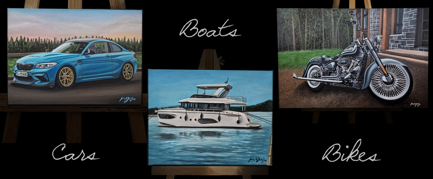 Utilizing a blend of skill, technique, and passion, I meticulously transfer the essence of your chosen subject onto canvas. Every brushstroke is imbued with intention, every color carefully chosen to evoke the spirit and character of your car, bike, or boat.